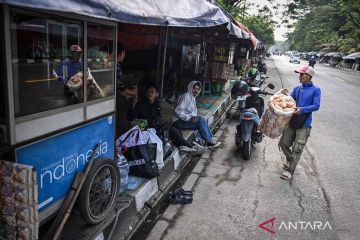 Pemudik beristirahat di warung kawasan Jembatan Rajamandala, Kabupaten Cianjur, Jawa Barat, Sabtu (14/3/2026). Jalur lama Jakarta-Bandung via Cianjur tersebut menjadi alternatif pemudik menghindari kemacetan di jalur utama, sekaligus menghadirkan suasana nostalgia dalam perjalanan dengan deretan warung tempat pengendara singgah untuk makan dan beristirahat. ANTARA FOTO/Bayu Pratama S/nym.