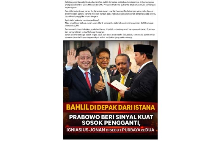 Unggahan tersebut memuat klaim, “BAHLIL DI DEPAK DARI ISTANA, PRABOWO BERI SINYAL KUAT SOSOK PENGGANTI. IGNASIUS JONAN DISEBUT PURBAYA KE DUA,” serta menyebut pertemuan Jonan dengan Presiden Prabowo sebagai tanda akan terjadinya pergantian menteri.