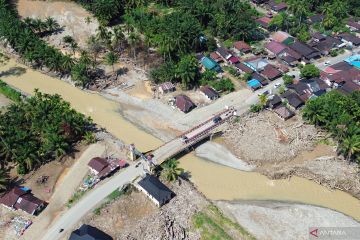 Foto udara sejumlah kendaraan pemudik melintasi jalur yang selesai diperbaiki akibat bencana longsor dan banjir bandang di Desa Aek Garoga, Batang Toru, Kabupaten Tapanuli Selatan, Sumatera Utara, Rabu (18/3/2026). Jalur utama mudik Lebaran Idul Fitri 1447 Hijriah di Tapanuli Selatan yang sebelumnya putus akibat bencana longsor dan banjir bandang kini selesai diperbaiki sehingga pemudik bisa melintas seperti biasa. ANTARA FOTO/Yudi Manar/foc.