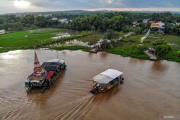 Foto udara perahu penyeberangan melintas di Sungai Brantas di Jatikalen, Nganjuk, Jawa Timur, Minggu (22/3/2026). Pada hari kedua Idul Fitri 1447 Hijriah, perahu penyeberangan yang menghubungkan Kabupaten Nganjuk dengan Kabupaten Jombang itu jumlah pengguna jasanya meningkat dibanding hari biasanya yakni dari sekitar lima ratus kendaraan per hari menjadi seribu kendaraan per hari dengan tarif Rp2 ribu untuk roda dua, Rp5 ribu untuk roda empat, dan untuk penumpang pejalan kaki gratis. ANTARA FOTO/Muhammad Mada/wsj.