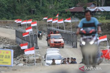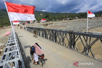 Sejumlah warga melintasi jembatan bailey beutong ateuh banggalang yang baru selesai dibangun di Desa Blang Beurandeh, Nagan Raya, Aceh, Sabtu (10/1/2026). Kementerian Pekerjaan Umum bersama TNI AD menyelesaikan pembangunan Jembatan Bailey yang menghubungkan Kabupaten Nagan Raya dengan Kabupaten Aceh Tengah sehingga akses transportasi kembali tersambung dan memulihkan ekonomi daerah terdampak bencana. ANTARA FOTO/Syifa Yulinnas/nz