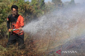 Petugas Badan Penanggulangan Bencana Daerah (BPBD) Aceh Barat melakukan upaya pemadaman dan pendinginan kebakaran hutan dan lahan (karhutla) di lahan gambut Desa Suak Raya, Johan Pahlawan, Aceh Barat, Aceh, Sabtu (17/1/2026). Polres Aceh Barat sebelumnya telah sering memberikan sosialisasi tentang larangan membuka lahan dengan cara membakar namun aktivitas pembukaan lahan baru dengan cara dibakar masih sering dilakukan oknum tidak bertanggung jawab, sementara berdasarkan data Pusat Pengendalian dan Operasi Penanggulangan Bencana (Pusdalops PB) BPBD Aceh Barat luas kebakaran karhutla telah mencapai 5 hektare. ANTARA FOTO/Syifa Yulinnas/tom.