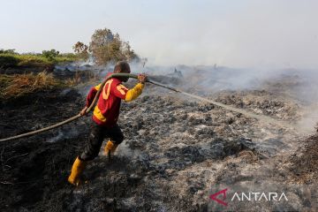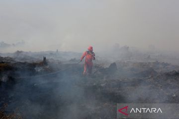 Petugas BPBD Aceh Barat melakukan upaya penanganan dan penyekatan kebakaran hutan dan lahan di kawasan lahan gambut Desa Suak Nie, Johan Pahlawan, Aceh Barat, Aceh, Minggu (25/1/2026). Kabakaran hutan dan lahan (Karhutla) yang terjadi sejak Kamis (15/1) diduga untuk pembukaan lahan baru tersebut terus meluas dari 12 hektare menjadi 17 hektare yang tersebar di Kecamatan Johan Pahlawan, Woyla dan Kecamatan Meureubo. ANTARA FOTO/Syifa Yulinnas/rwa.