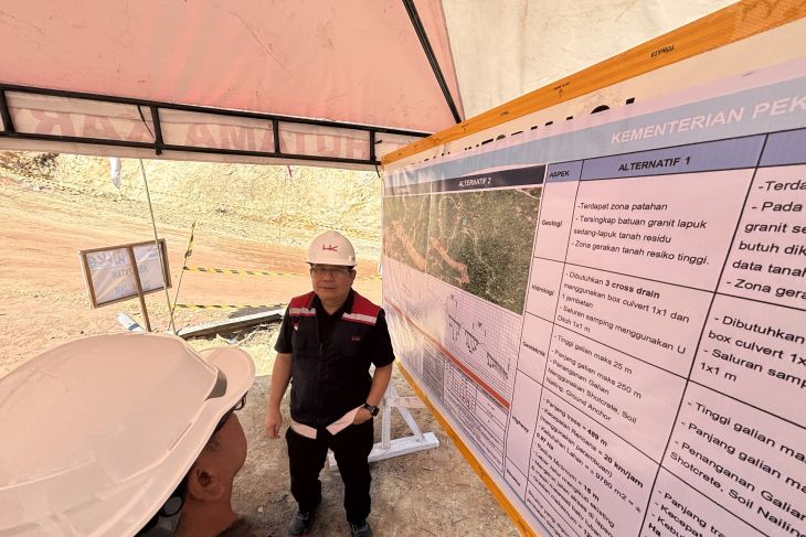 Project Manajer PT Hutama Karya Mikael Turnip menjelaskan peta perbaikan jalur yang putus akibat longsor di Desa Simaninggir, Kecamatan Situhuis Kabupaten Tapanuli Tengah, Sumatera Utara pada Sabtu (24/1/2026) ANTARA/Mario Sofia NasutionDalam pengerjaan, pihaknya berupaya berhati-hati dan melakukan kajian terhadap kualitas tanah yang ada di lokasi.