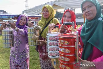 Warga membawa rantang makanan saat mengikuti Lebaran Kukusan di Lapangan Kukusan, Kota Depok, Jawa Barat, Minggu (12/4/2026). Silahturahmi bertema Lebaran Kukusan dengan kegiatan makan bersama itu merupakan napak tilas suasana Lebaran suku Betawi tempo dulu yang bertujuan untuk melestarikan budaya daerah . ANTARA FOTO/Yulius Satria Wijaya/YU