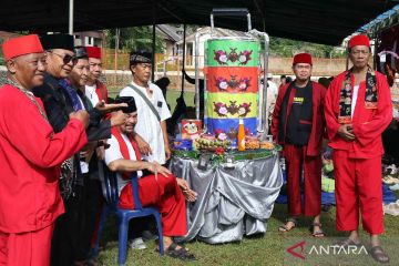 Warga mengenakan pakaian khas betawi foto bersama saat mengikuti Lebaran Kukusan di Lapangan Kukusan, Kota Depok, Jawa Barat, Minggu (12/4/2026). Silahturahmi bertema Lebaran Kukusan dengan kegiatan makan bersama itu merupakan napak tilas suasana Lebaran suku Betawi tempo dulu yang bertujuan untuk melestarikan budaya daerah . ANTARA FOTO/Yulius Satria Wijaya/YU