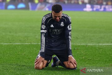 Pesepak bola Real Madrid Kylian Mbappe berlutut usai klubnya kalah dari tuan rumah Benfica dalam pertandingan lanjutan Liga Champions UEFA di Stadion da Luz, Lisbon, Portugal, Rabu (28/1/2026) waktu setempat. Benfica tundukkan Real Madrid 4-2. ANTARA FOTO/REUTERS/Pedro Nunes/wsj.