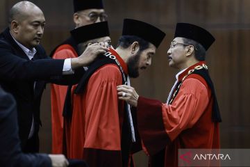 Ketua Mahkamah Konstitusi (MK) Suhartoyo (kanan) melepas kalung jabatan Hakim Konstitusi Anwar Usman (tengah) pada Wisuda Purnabakti dan Penyambutan Hakim Konstitusi di Gedung MK, Jakarta, Senin (13/4/2026). Mahkamah Konstitusi menggelar Wisuda Purnabakti Hakim Konstitusi Anwar Usman yang memasuki masa pensiun dan penyambutan dua Hakim Konstitusi baru yakni Adies Kadir dan Liliek Prisbawono Adi. ANTARA FOTO/Dhemas Reviyanto/nym.