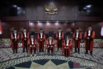 Ketua Mahkamah Konstitusi (MK) Suhartoyo (tengah) berfoto bersama dengan Wakil Ketua MK Saldi Isra (ketiga kiri), Hakim Konstitusi (dari kiri) Adies Kadir, Arsul Sani, Daniel Yusmic P Foekh, M. Guntur Hamzah, Enny Nurbaningsih, Ridwan Mansyur, dan Liliek Prisbawono Adi seusai Wisuda Purnabakti dan Penyambutan Hakim Konstitusi di Gedung MK, Jakarta, Senin (13/4/2026). Mahkamah Konstitusi menggelar Wisuda Purnabakti Hakim Konstitusi Anwar Usman yang memasuki masa pensiun dan penyambutan dua Hakim Konstitusi baru yakni Adies Kadir dan Liliek Prisbawono Adi. ANTARA FOTO/Dhemas Reviyanto/nym.