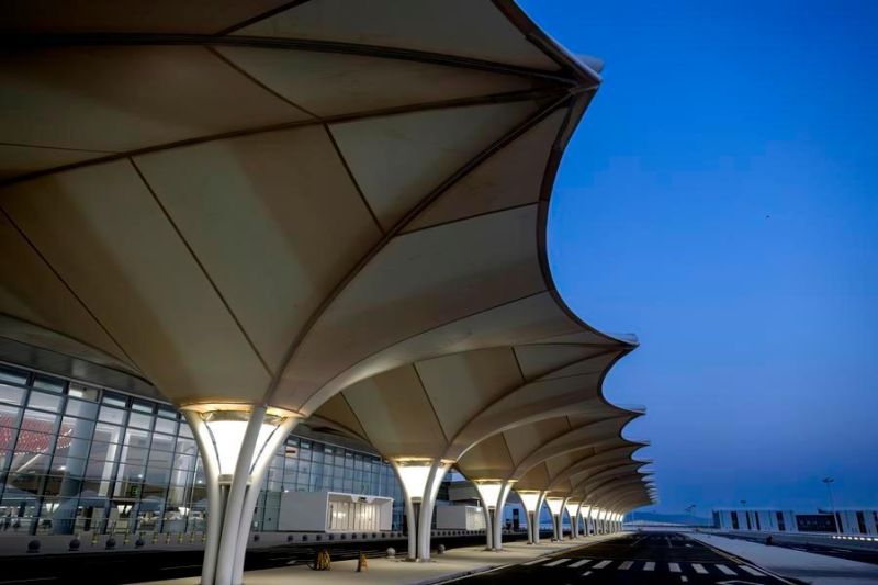 Foto yang diabadikan menggunakan drone pada 20 Januari 2026 ini menunjukkan pemandangan bagian luar aula keberangkatan Bandar Udara Internasional Xiang'an Xiamen di Xiamen, Provinsi Fujian, China. (Xinhua/Wei Peiquan)