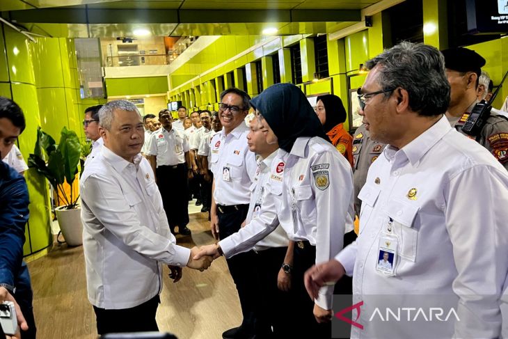 Menteri Perhubungan Dudy Purwagandhi berjabatangan dengan petugas KAI dalam Apel Gelar Pasukan PT KAI dalam rangka Operasi Angkutan Natal 2025 dan Tahun Baru 2026 di Stasiun Gambir Jakarta, Kamis malam (18/12/2025). ANTARA/HariantoMenhub menegaskan pula keselamatan tidak boleh bersifat reaktif, melainkan harus menjadi budaya kerja sehari-hari, dikelola preventif berbasis data lapangan di setiap lini operasional perkeretaapian nasional profesional modern adaptif konsisten berkelanjutan.