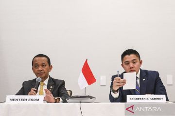 Menteri ESDM Bahlil Lahadalia (kiri) bersama Sekretaris Kabinet Teddy Indra Wijaya memberikan keterangan pers terkait perjanjian perdagangan timbal balik (ART) Indonesia-AS di bidang ESDM di Washington DC, Amerika Serikat, Jumat (20/2/2026). Dalam ART itu pemerintah Indonesia sepakat untuk mengimpor migas hingga 15 miliar dolar AS atau sekitar Rp 253,47 triliun per tahun dari Amerika Serikat untuk ketahanan energi dalam negeri. ANTARA FOTO/Hafidz Mubarak A/bar
