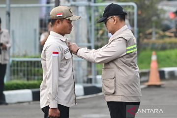 Menteri Haji dan Umrah RI Mochamad Irfan Yusuf (kiri) menyalami Petugas Penyelenggara Ibadah Haji (PPIH) pada apel pelepasan di Asrama Haji Pondok Gede, Jakarta, Kamis (23/4/2026). Kementerian Haji dan Umrah melepas sekitar 200 orang PPIH Arab Saudi Daerah Kerja (Daker) Makkah. ANTARA FOTO/Fakhri Hermansyah/sgd
