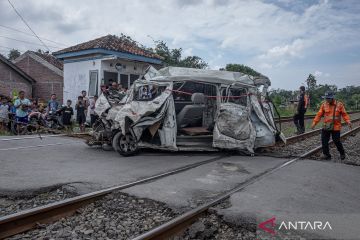 Kondisi bangkai mobil Daihatsu Grand Max bernomor polisi H 1051 VA yang tertabrak (tertemper) KA Harina relasi Surabaya Pasarturi-Bandung di perlintasan kereta api tanpa palang pintu KM 11+7/8 antara Stasiun Brumbung, Demak - Stasiun Alastua, Semarang, di Desa Brumbung, Kecamatan Mranggen, Kabupaten Demak, Jawa Tengah, Minggu (15/2/2026). Kecelakaan tersebut mengakibatkan pengemudi mobil tewas dan satu warga mengalami luka setelah sempat terseret, sementara lokomotif dan pembangkit KA Harina mengalami kerusakan yang telah diperbaiki di Stasiun Semarang Tawang sehingga perjalanan kereta terlambat sekitar 102 menit. ANTARA FOTO/Aji Styawan/wpa.