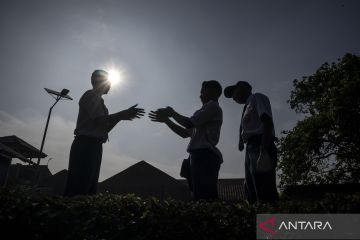 Siluet siswa saling bersalaman saat hari pertama masuk sekolah di Sekolah Rakyat Menengah Pertama (SRMP) 8 Cimahi, Kota Cimahi, Jawa Barat, Senin (30/3/2026). Sebanyak 93 siswa SRMP 8 Cimahi kembali ke asrama pada hari pertama masuk sekolah pascalibur Idul Fitri 1447 Hijriah diawali dengan tradisi halalbihalal sebelum memulai pembelajaran dan kegiatan akademis lainnya. ANTARA FOTO/Abdan Syakura/sgd