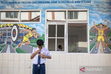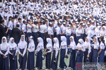 Seorang siswa merapikan dasi sebelum masuk ke dalam kelas saat hari pertama masuk sekolah di Sekolah Rakyat Menengah Pertama (SRMP) 8 Cimahi, Kota Cimahi, Jawa Barat, Senin (30/3/2026). Sebanyak 93 siswa SRMP 8 Cimahi kembali ke asrama pada hari pertama masuk sekolah pascalibur Idul Fitri 1447 Hijriah diawali dengan tradisi halalbihalal sebelum memulai pembelajaran dan kegiatan akademis lainnya. ANTARA FOTO/Abdan Syakura/sgd