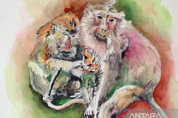 Lukisan monyet dengan cat air karya pelukis Vonny Ratna Indah. (Xinhua) Pada lukisan pertama dan ketiga, "Balinese Monkey 1" dan "Balinese Monkey 3", berbagai gesture seperti tatapan, gerak tangan, hingga embusan napas primata itu digambarkan untuk mewakili perjuangan mereka bertahan hidup di tengah ekosistem yang terus berubah.