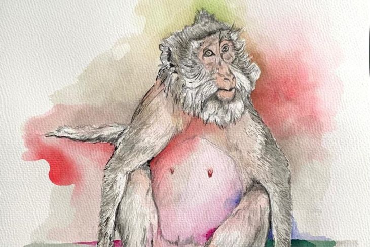 Lukisan monyet dengan cat air karya pelukis Vonny Ratna Indah. (Xinhua) (Xinhua) (Xinhua)Untuk pemilihan warna dalam setiap lukisan, Vonny mengungkapkan alasan penggunaan dominasi merah muda dan hijau kecoklatan.