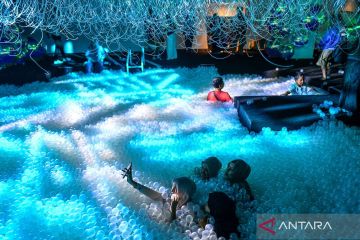 Pengunjung bermain dalam wahana Wonderlab di Paris Van Java (PVJ) Mall, Bandung, Jawa Barat, Jumat (26/12/2025). Wahana wonderlab menyuguhkan wahana museum cahaya immersive dengan beberapa ruangan instalasi konsep visual yang berbeda-beda untuk memeriahkan libur Natal 2025 dan Tahun Baru 2026. ANTARA FOTO/Raisan Al Farisi/nym.