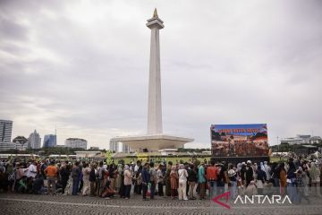 Warga antre untuk menukarkan kupon sembako pada Pasar Murah untuk Rakyat di kawasan Monas, Jakarta, Sabtu (28/3/2026). Pemerintah menyediakan 100.000 kupon belanja sembako dan barang gratis senilai Rp500.000 serta 300.000 porsi makanan gratis yang disajikan oleh sekitar 800 pedagang kaki lima untuk masyarakat pada acara tersebut. ANTARA FOTO/Dhemas Reviyanto/tom.