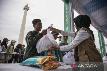 Petugas melayani warga yang mengambil paket sembako pada Pasar Murah Untuk Rakyat di kawasan Monas, Jakarta, Sabtu (28/3/2026). Pemerintah menyediakan 100.000 kupon belanja sembako dan barang gratis senilai Rp500.000 serta 300.000 porsi makanan gratis yang disajikan oleh sekitar 800 pedagang kaki lima untuk masyarakat pada acara tersebut. ANTARA FOTO/Dhemas Reviyanto/tom.