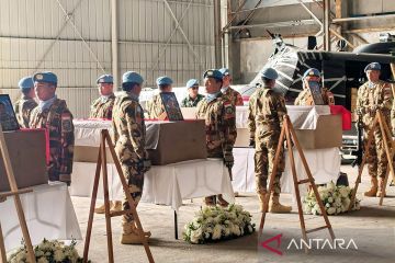 Suasana upacara pelepasan dan penghormatan tiga jenazah personel penjaga perdamaian Indonesia yang tergabung dalam misi United Nations Interim Force in Lebanon (UNIFIL) di Hanggar Lebanese Air Force, Beirut, Lebanon, Kamis (2/4/2026). Pemerintah Indonesia memastikan pemulangan jenazah ketiga personel penjaga perdamaian tersebut yang gugur saat bertugas di Lebanon pada 29 dan 30 Maret 2026. ANTARA FOTO/HO/Bakom RI/rwa.