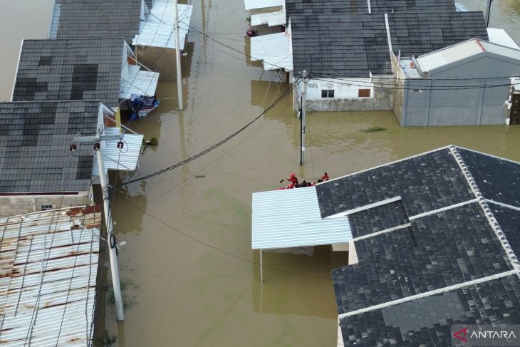 Banjir menggenangi kompleks perumahan di wilayah Kecamatan Sukawangi, Kabupaten Bekasi, Jumat.ANTARA/Pradita Kurniawan Syah.Ia menjelaskan titik pengungsian korban banjir saat ini tersebar di tujuh wilayah kecamatan terdampak paling parah meliputi Babelan, Cikarang Utara, Karangbahagia, Sukakarya, Sukawangi, Tambun Selatan serta Kecamatan Tambun Utara.