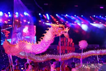 Peserta menampilkan tarian naga saat Parade Chingay pada perayaan Tahun Baru Imlek di Singapura, Jumat (27/2/2026). ANTARA FOTO/Xinhua/Then Chih Wey/agr