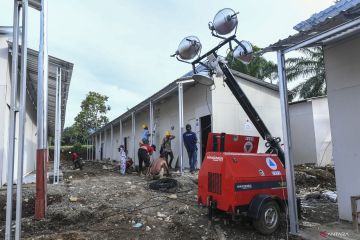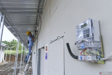 Petugas memasang instalasi listrik di rumah hunian sementara (huntara) Padang Gantiang di Palembayan, Agam, Sumatera Barat, Rabu (18/2/2026). Pemkab Agam menargetkan huntara kedua di Palembayan yang bisa menampung 88 kepala keluarga penyintas bencana banjir bandang tersebut bisa ditempati pada hari pertama Ramadhan. ANTARA FOTO/Wahdi Septiawan/foc.