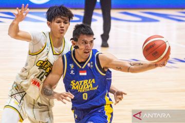 Pebasket Satria Muda Pertamina Bandung Juan Kokodiputra (kanan) diadang pebasket Pacific Caesar Surabaya Darren Celosse (kedua kanan) pada pertandingan IBL 2026 di GOR Bandung Arena, Bandung, Jawa barat (30/1/2026). Satria Muda Pertamina Bandung menang lawan Pacific Caesar dengan skor 106-56. ANTARA FOTO/Novrian Arbi/agr
