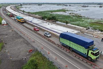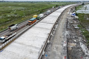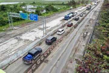 Foto udara sejumlah kendaraan melintasi Jalan Tol Trans Sumatera (JTTS) ruas Kayu Agung-Palembang (Kapal) saat penerapan rekayasa lalu lintas lawan arah (contraflow) di Jejawi, Ogan Komering Ilir (OKI), Sumatera Selatan, Senin (23/2/2026). Progres perbaikan konstruksi slab on pile (peninggian) pada ruas Tol Kayuagung–Palembang (Kapal) jalur A km 345+150 sd 348+850 yang mengalami rekayasa lalu lintas lawan arah (contraflow) telah mencapai 86 persen dan ditargetkan normal kembali pada 10 Maret 2026 mendatang. ANTARA FOTO/Nova Wahyudi/wsj.