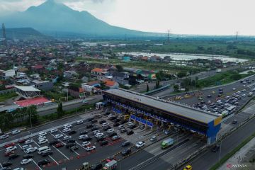 Foto udara kendaraan antre memasuki Gerbang Tol Kejapanan (GT) Kejapanan, Gempol, Pasuruan, Jawa Timur, Senin (23/3/2026). PT Jasamarga Transjawa Tol (JTT) mencatat puncak pergerakan kendaraan tertinggi di wilayah Jawa Timur pada momentum arus mudik Idul Fitri 1447H sebanyak 42.460 kendaraan melintas menuju arah Malang melalui Gerbang Tol (GT) Kejapanan Utama Pada tanggal 22 Maret 2026. ANTARA FOTO/Umarul Faruq/foc.