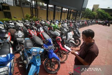 Petugas mendata ratusan sepeda motor yang terjaring razia di halaman Polresta Sidoarjo, Jawa Timur, Jumat (20/2/2026). Satuan Lalu lintas Polresta Sidoarjo mengamankan sekitar 300 unit sepeda motor yang diduga digunakan balap liar di kawasan eks Jalan Tol Porong-Gempol usai sahur di bulan Ramadhan 1447 H. ANTARA FOTO/Umarul Faruq/rwa.