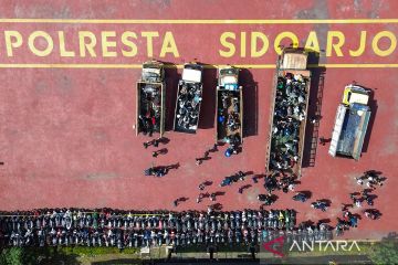 Foto udara ratusan sepeda motor yang terjaring razia diparkir di halaman Polresta Sidoarjo, Jawa Timur, Jumat (20/2/2026). Satuan Lalu lintas Polresta Sidoarjo mengamankan sekitar 300 unit sepeda motor yang diduga digunakan balap liar di kawasan eks Jalan Tol Porong-Gempol usai sahur di bulan Ramadhan 1447 H. ANTARA FOTO/Umarul Faruq/rwa.