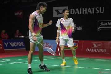 Pebulu tangkis ganda putra Indonesia Nikolaus Joaquin (kiri) dan Raymond Indra (kanan) bereaksi usai meraih poin dari lawan sesama Indonesia, Sabar Karyaman Gutama/Moh Reza Pahlevi Isfahani pada babak semi final Daihatsu Indonesia Masters 2026 di Istora Senayan, Jakarta, Sabtu (24/1/2026). Raymond dan Joaquin melaju ke babak final usai menang dua gim 21-19 dan 21-14. ANTARA FOTO/Aditya Pradana Putra/wsj.