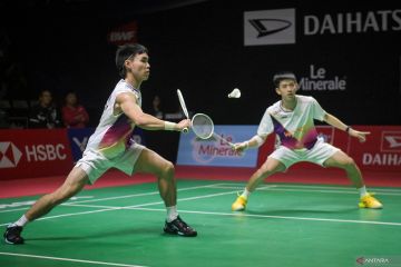 Pebulu tangkis ganda putra Indonesia Nikolaus Joaquin (kanan) dan Raymond Indra (kiri) bereaksi usai meraih poin dari lawan sesama Indonesia, Sabar Karyaman Gutama/Moh Reza Pahlevi Isfahani pada babak semi final Daihatsu Indonesia Masters 2026 di Istora Senayan, Jakarta, Sabtu (24/1/2026). Raymond dan Joaquin melaju ke babak final usai menang dua gim 21-19 dan 21-14. ANTARA FOTO/Aditya Pradana Putra/wsj.