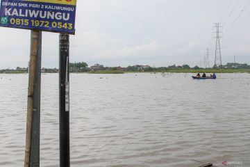 Warga menggunakan perahu saat melintasi jalan desa yang terendam banjir di Desa Setrokalangan, Kabupaten Kudus, Jawa Tengah, Sabtu (17/1/2026). Badan Penanggulangan Bencana Daerah (BPBD) Kudus mencatat banjir yang terjadi mengakibatkan 5.425 rumah terendam di 38 desa tujuh kecamatan serta mengakibatkan 43.479 jiwa/13.956 KK terdampak. ANTARA FOTO/Nirza/wsj.