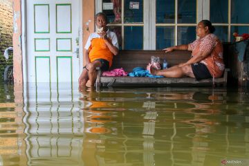 Warga duduk di depan rumah yang terendam banjir di Desa Tanjungkarang, Kabupaten Kudus, Jawa Tengah, Sabtu (17/1/2026). Badan Penanggulangan Bencana Daerah (BPBD) Kudus mencatat banjir yang terjadi mengakibatkan 5.425 rumah terendam di 38 desa tujuh kecamatan serta mengakibatkan 43.479 jiwa/13.956 KK terdampak. ANTARA FOTO/Nirza/wsj.