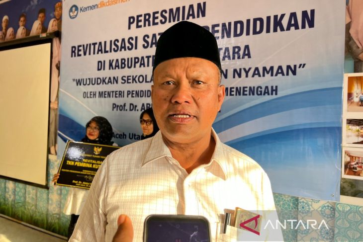 Kepala SMA Negeri 1 Baktiya Marzuki Hasan menjawab pertanyaan ANTARA ditemui di Aceh Utara. ANTARA/HariantoMarzuki menjelaskan selama masa pengungsian, distribusi makanan bergizi dialihkan ke pesantren dan lokasi pengungsian agar tetap dapat dimanfaatkan oleh siswa serta masyarakat terdampak.