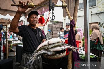 Pedagang menimbang ikan bandeng yang dijualnya pada Festival Bandeng Rawa Belong 2026 di Jakarta, Sabtu (14/2/2026). Pemerintah DKI Jakarta menggelar festival tersebut pada 14-15 Februari 2026 sebagai ajang merayakan Tahun Baru Imlek sekaligus menjadi ruang penggerak ekonomi UMKM. ANTARA FOTO/Fauzan/nz