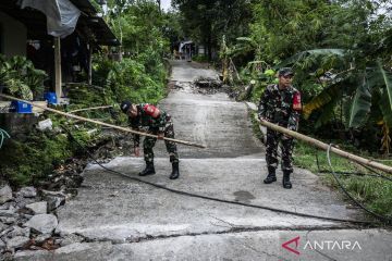 Personel Babinsa menutup akses jalan yang terdampak bencana tanah bergerak di Kampung Sekip, Jangli, Tembalang, Semarang, Jawa Tengah, Selasa (10/2/2026). BPBD Kota Semarang mencatat sebanyak 15 rumah mengalami kerusakan, jalan akses menuju kampung amblas, serta saluran air PDAM rusak akibat bencana tanah bergerak yang dipicu hujan dengan intensitas tinggi pada Kamis (5/2) hingga Jumat (6/2) dini hari. ANTARA FOTO/Aprillio Akbar/nz