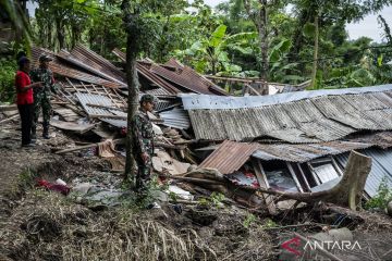 Personel Babinsa dan warga setempat melihat rumah terdampak bencana tanah bergerak di Kampung Sekip, Jangli, Tembalang, Semarang, Jawa Tengah, Selasa (10/2/2026). BPBD Kota Semarang mencatat sebanyak 15 rumah mengalami kerusakan, jalan akses menuju kampung amblas, serta saluran air PDAM rusak akibat bencana tanah bergerak yang dipicu hujan dengan intensitas tinggi pada Kamis (5/2) hingga Jumat (6/2) dini hari. ANTARA FOTO/Aprillio Akbar/nz