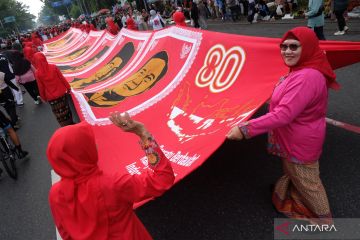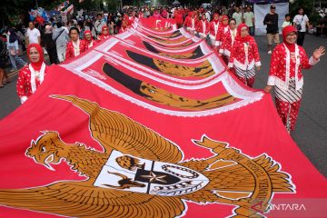 Anggota Komunitas Cinta Kebaya Depok membentangkan kain batik tulis sepanjang 17 meter dengan motif gambar wajah presiden Republik Indonesia saat parade di Jalan Slamet Riyadi Solo, Jawa Tengah, Minggu (1/2/2026). Kegiatan tersebut digelar sebagai kampanye pelsetarian kain batik dan busana kebaya serta wujud apresiasi terhadap jasa presiden-presiden Indonesia. ANTARAFOTO/Maulana Surya/aww.
