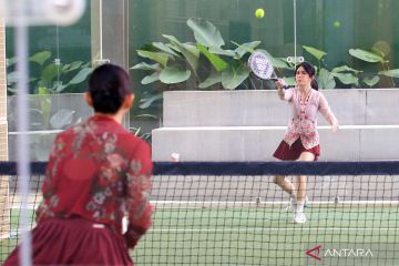 Peserta bermain padel dengan menggunakan baju kebaya saat acara merayakan kebaya dalam gaya hidup aktif generasi muda di Kebayoran Lama, Jakarta, Sabtu (7/2/2026). Padel Berkebaya merupakan gerakan sosial yang mempromosikan kebaya sebagai identitas perempuan Indonesia yang fleksibel dan relevan dalam berbagai aktivitas, termasuk olahraga terutama untuk generasi muda sebagai bagian dari melestarikan warisan budaya takbenda. ANTARA FOTO/Muhammad Iqbal/aww.