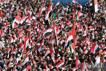 Warga Irak berunjuk rasa terkait serangan Amerika Serikat dan Israel terhadap Iran di Baghdad, Irak, (4/4/2026) waktu setempat. Ribuan warga Irak melakukan aksi solidaritas terhadap Iran dan mengecam serangan Amerika Serikat dan Israel. ANTARA FOTO/Xinhua/Khalil Dawood/sgd