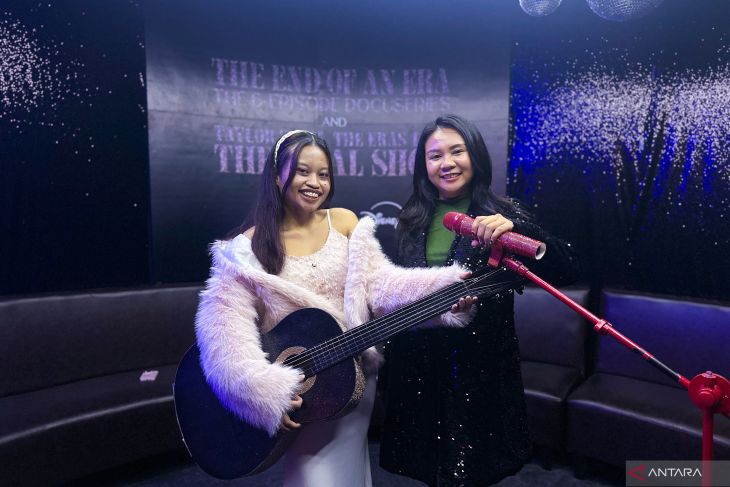 Penggemar Taylor Swift, Erika Pandiangan (kanan) dan Noviantari (kiri) berswafoto dengan kostum ala sang idola pada acara perayaan perilisan dua proyek spesial yang memberikan akses eksklusif di balik layar tur fenomenal Taylor Swift, The Eras Tour, di Jakarta pada Jumat (12/12/2025). Acara ini didukung oleh Disney+. (ANTARA/Pamela Sakina)"Tentu perayaan ini spesial, karena tur ini telah berlangsung hampir dua tahun, sehingga dokumenter ini menjadi momen emosional dan bersejarah bagi kami," ujar Erika Pandiangan.