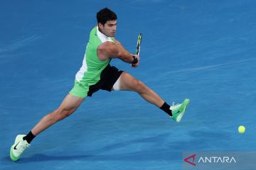 Petenis Spanyol Carlos Alcaraz mencoba mengembalikan bola ke arah lawannya asal Serbia Novak Djokovic dalam partai final Australian Open di Melbourne, Australia, Minggu (1/2/2026). Carlos Alcaraz mampu menang dengan skor 2-6, 6-2, 6-3, dan 7-5, untuk memastikan gelar juara Australian Open sekaligus mencatatkan sejarah sebagai petenis pria termuda sepanjang sejarah yang meraih empat titel grand slam yang berbeda di usia 22 tahun 272 hari, mengalahkan Rod Laver 24 tahun 32 hari, dan Rafael Nadal 24 tahun 102 hari. ANTARA FOTO/Xinhua/Ma Ping/bar