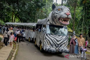Pengunjung menaiki mobil wisata di Taman Margasatwa Ragunan, Jakarta, Minggu (22/3/2026). Pengelola Taman Margasatwa Ragunan mencatat jumlah pengunjung pada hari kedua Idul Fitri 1447 H hingga pukul 12.00 WIB mencapai 43.348 orang dan ditargetkan mencapai 400.000 orang selama masa libur Lebaran. ANTARA FOTO/Putra M. Akbar/nym.