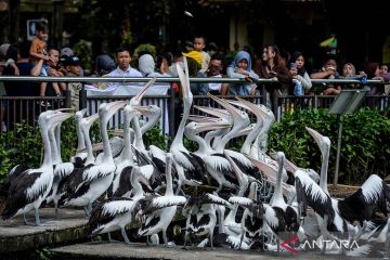 Liburan Lebaran di Taman Margasatwa Ragunan. Pengunjung melihat burung pelikan (Pelecanus onocrotalus) saat berwisata di Taman Margasatwa Ragunan, Jakarta, Minggu (22/3/2026). Pengelola Taman Margasatwa Ragunan mencatat jumlah pengunjung pada hari kedua Idul Fitri 1447 H hingga pukul 12.00 WIB mencapai 43.348 orang dan ditargetkan mencapai 400.000 orang selama masa libur Lebaran. ANTARA FOTO/Putra M. Akbar/nym.