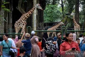 Pengunjung melihat jerapah (Giraffa camelopardalis) saat berwisata di Taman Margasatwa Ragunan, Jakarta, Minggu (22/3/2026). Pengelola Taman Margasatwa Ragunan mencatat jumlah pengunjung pada hari kedua Idul Fitri 1447 H hingga pukul 12.00 WIB mencapai 43.348 orang dan ditargetkan mencapai 400.000 orang selama masa libur Lebaran. ANTARA FOTO/Putra M. Akbar/nym.